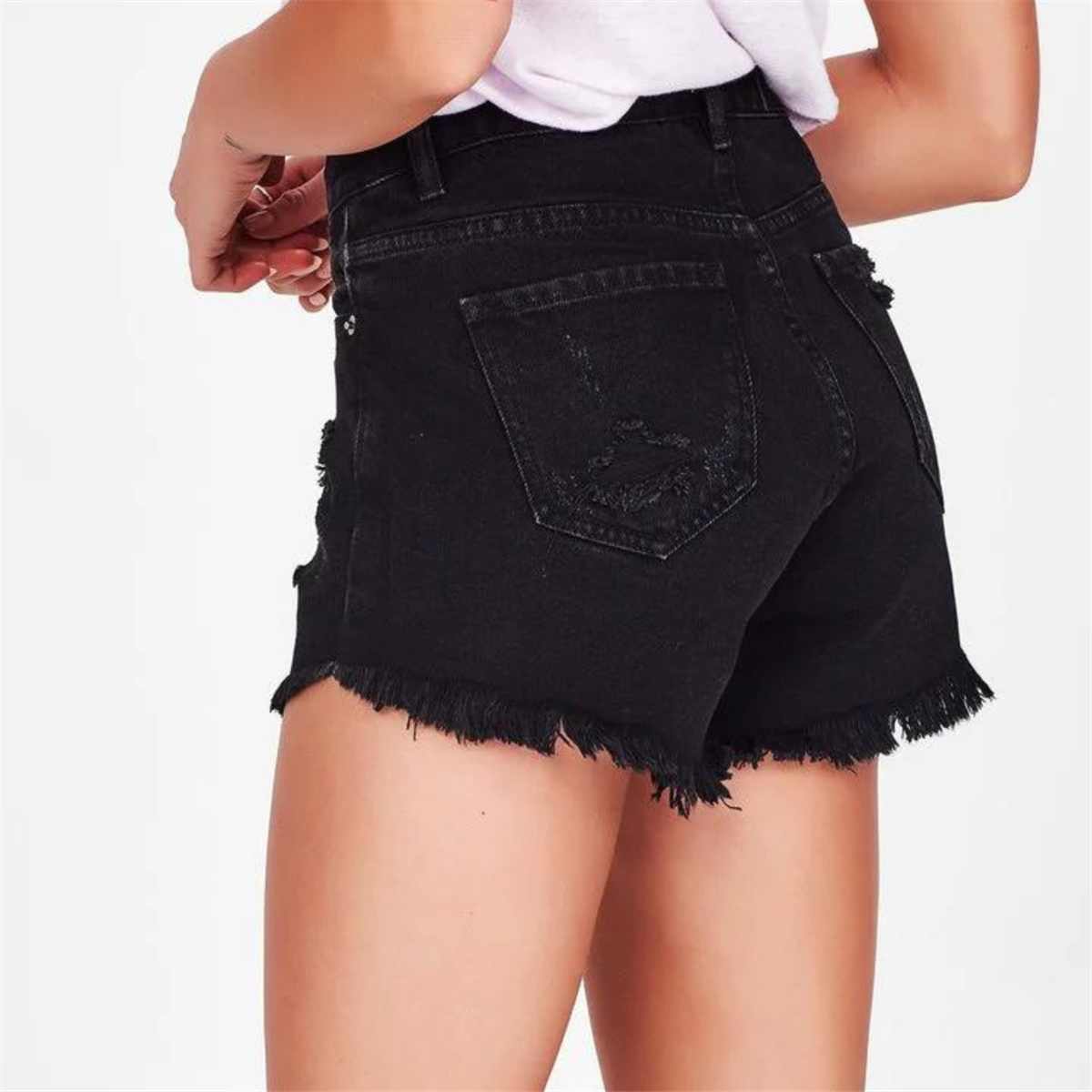 Mid-waisted ripped denim shorts.