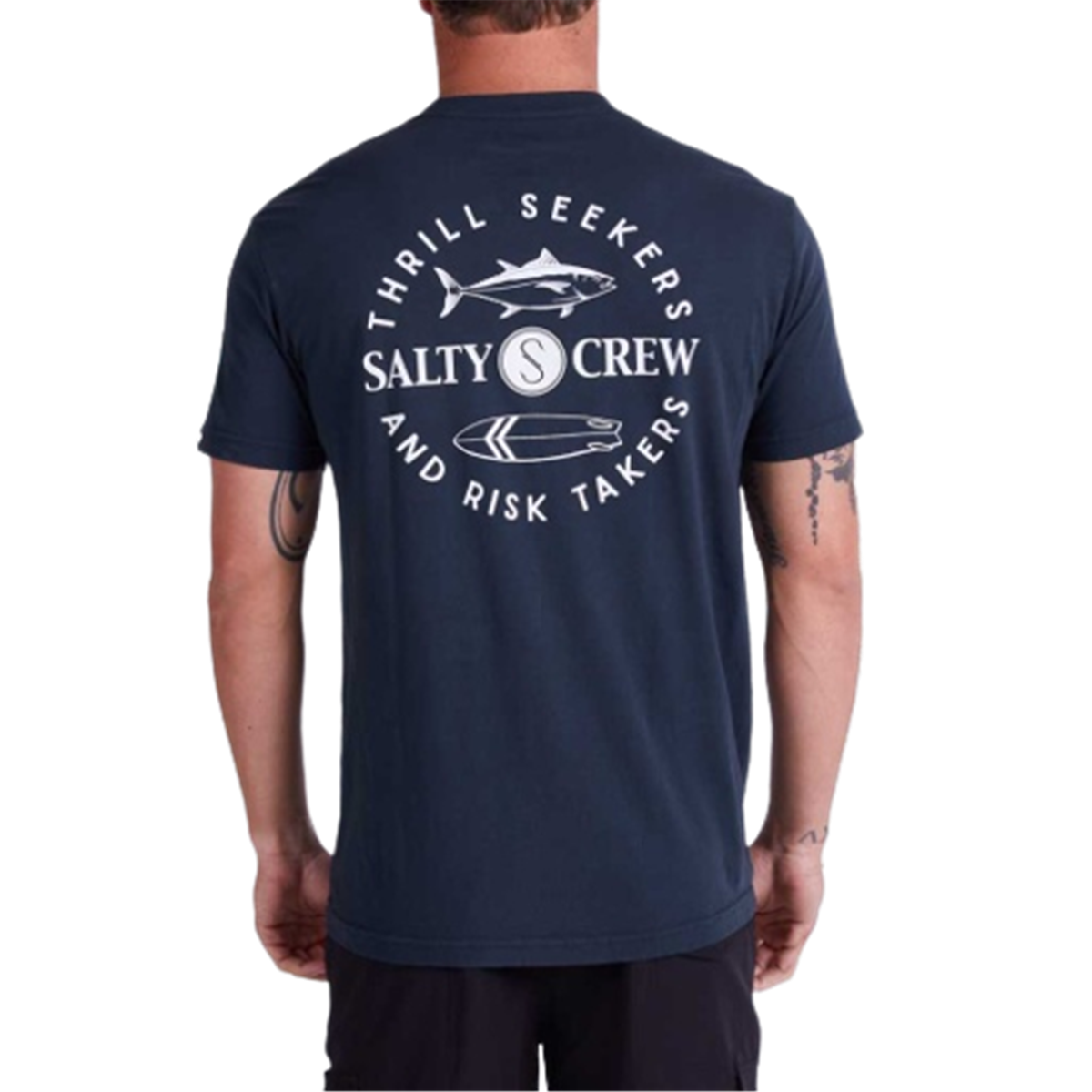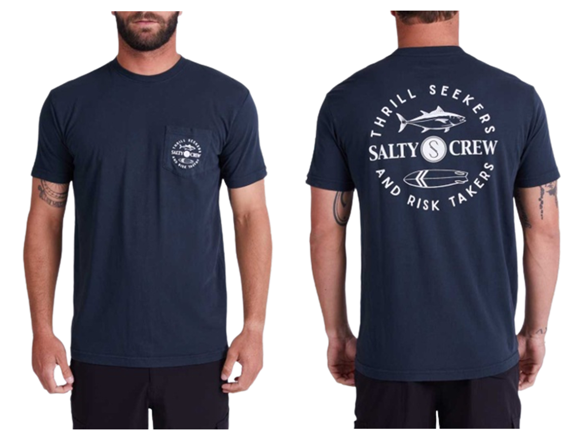 This black pocket tee from Salty Crew features screen-printed graphics on the front pocket and the back of the shirt.