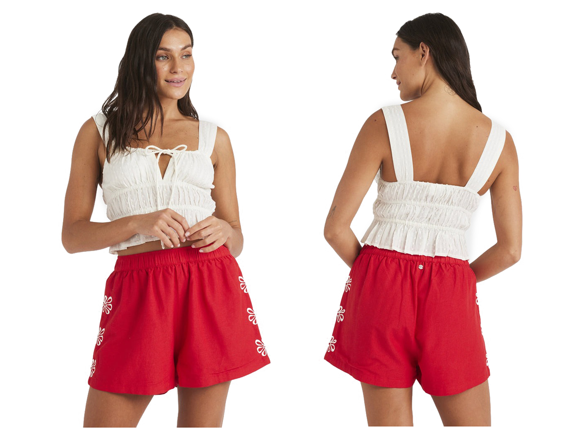- Floral embroidery on the seams adds surfy, feminine detail.