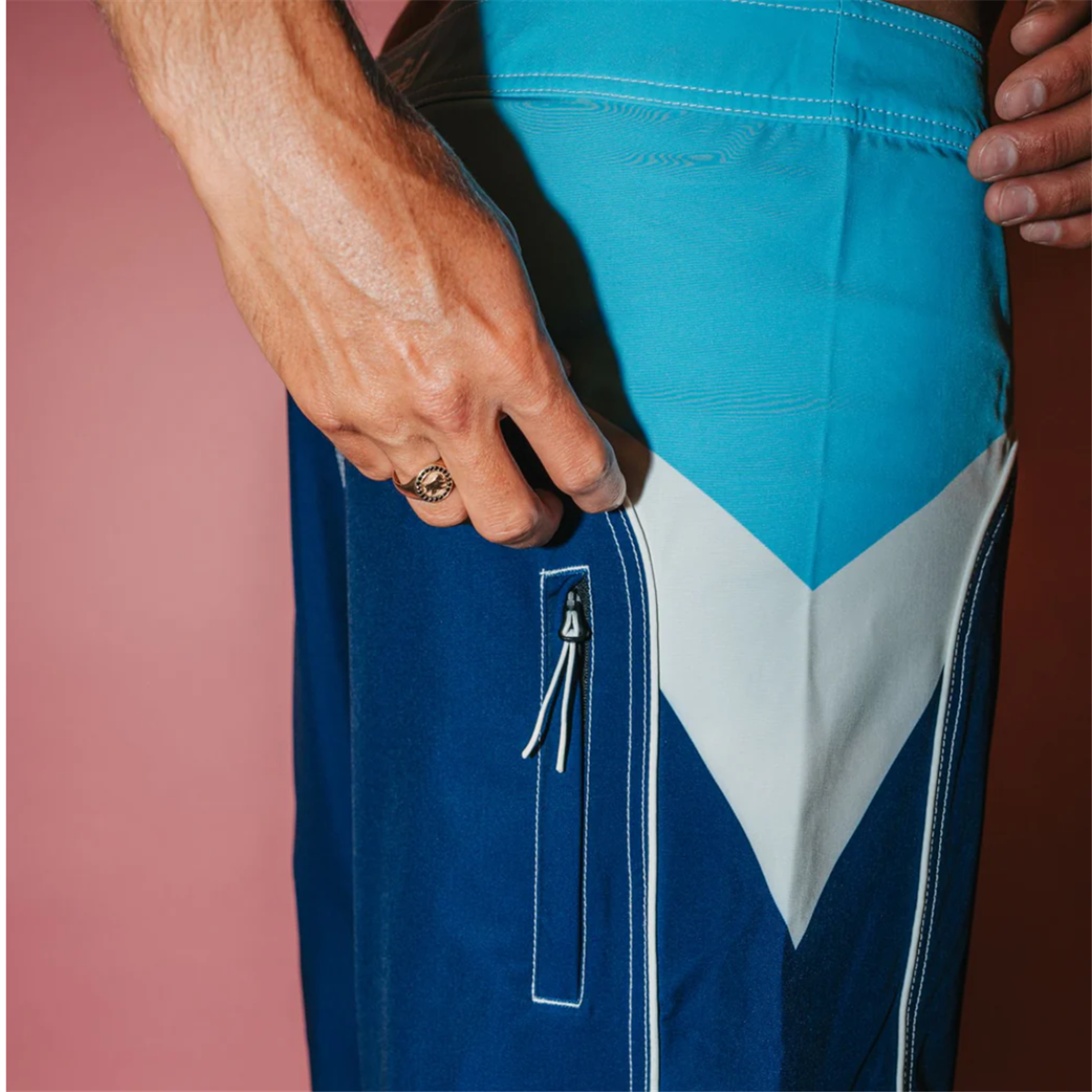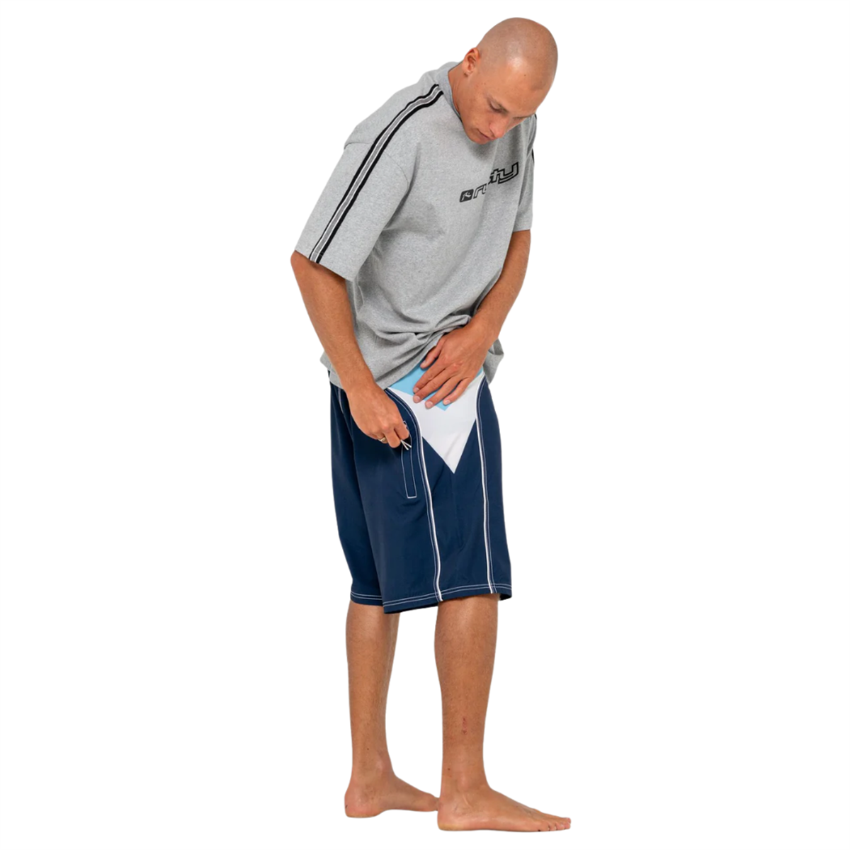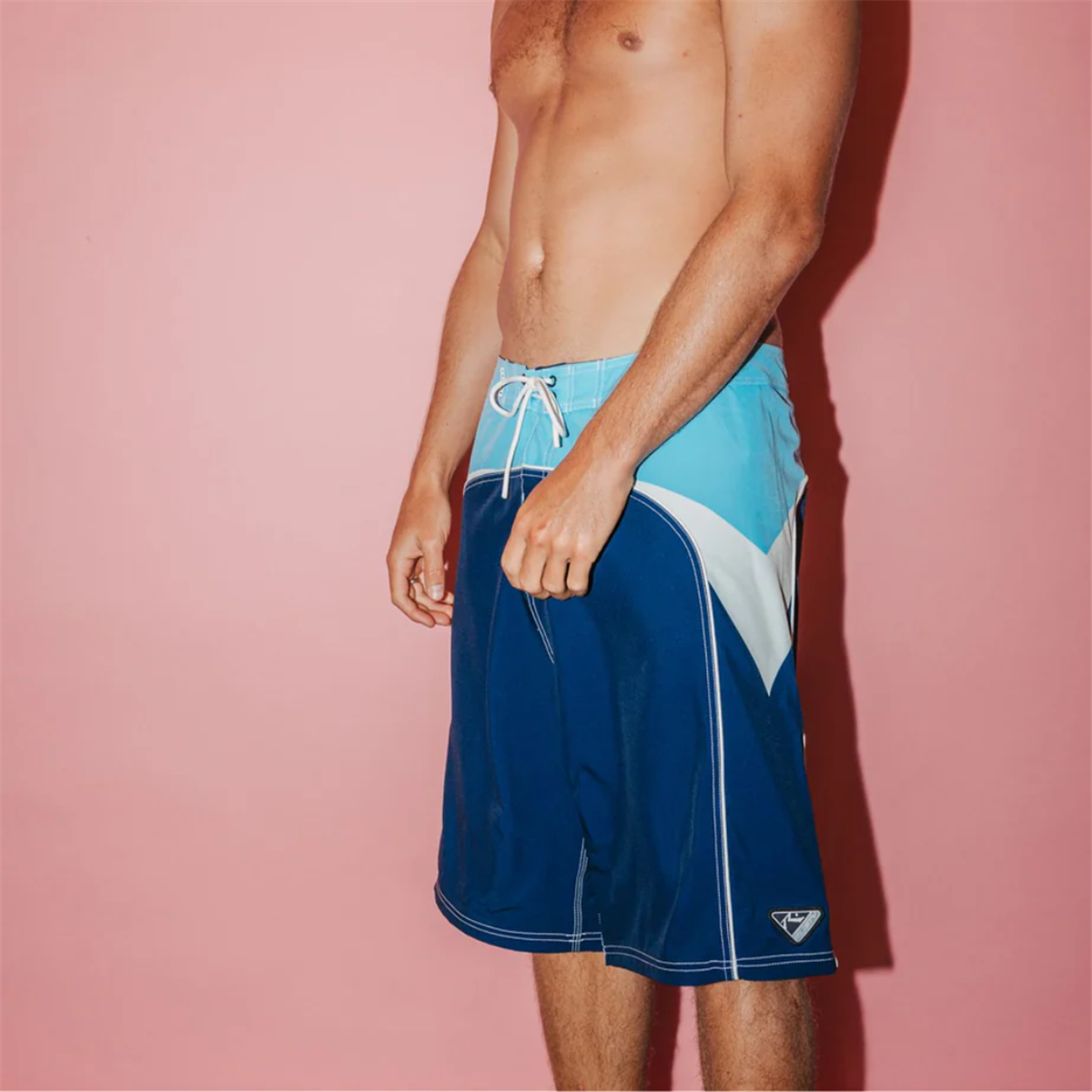 Baggy Fit Fixed Waist Boardshort With Piping Details And A 23" Inch Outseam. 52% Polyester / 38% Recycled Polyester / 10% Spandex 4 Way Stretch